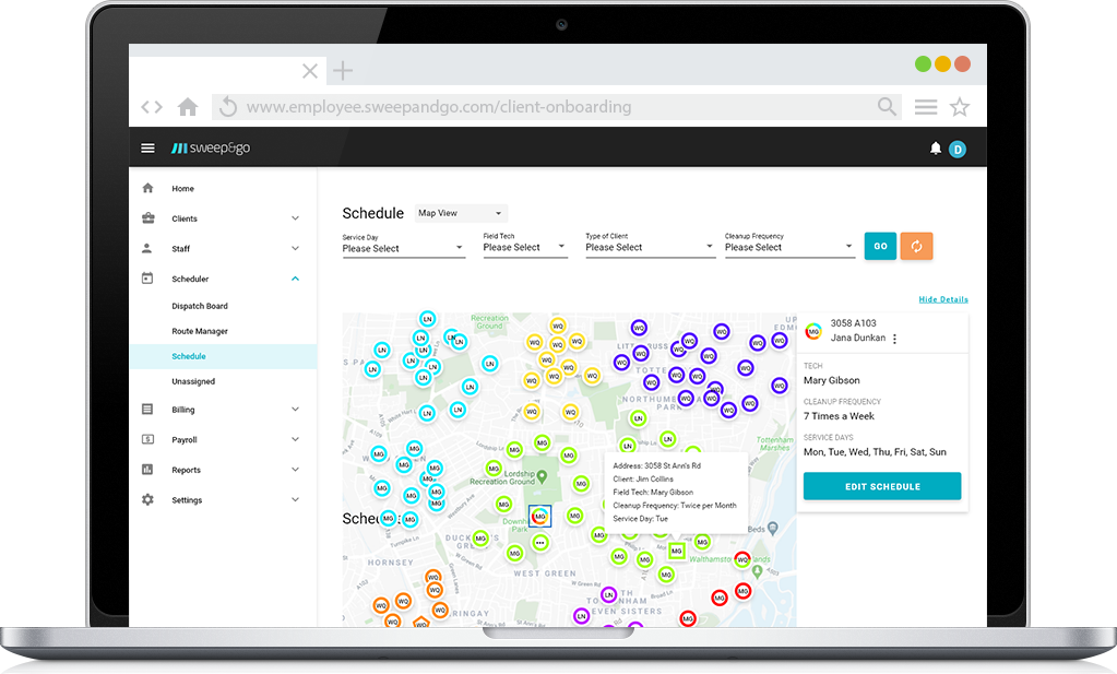 Sweep&Go has transformed my small business into a fully functioning scalable company. Not only does it handle all of my routes, invoices, payroll and specific details for each client it has also given me a more professional, easy to use client on boarding form that gives potential clients an immediate quote and adds them to my client portal. All we need to do is add them to our route and sweep&go handles the rest!