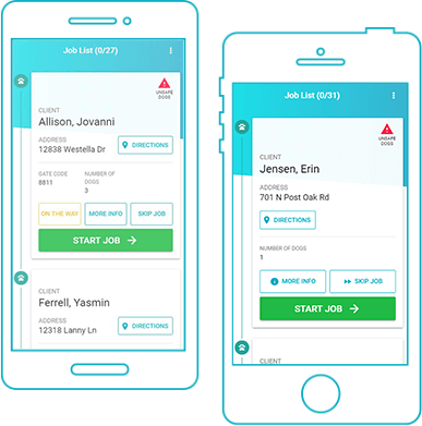 Field techs use the app to complete or skip jobs, track time and mileage, enter break time and notify clients who requested “on the way” notifications.