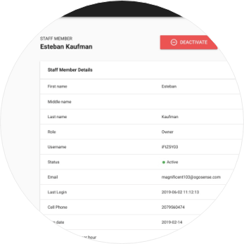 - Create, modify or deactivate staff members.