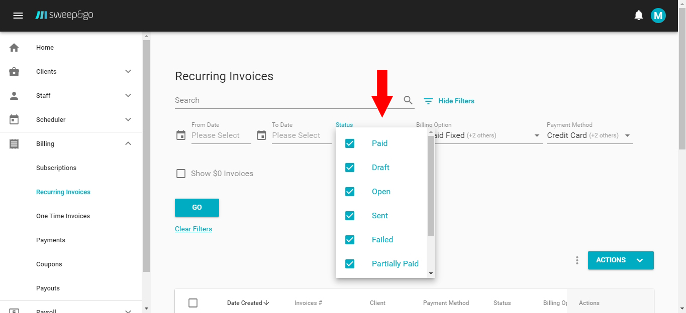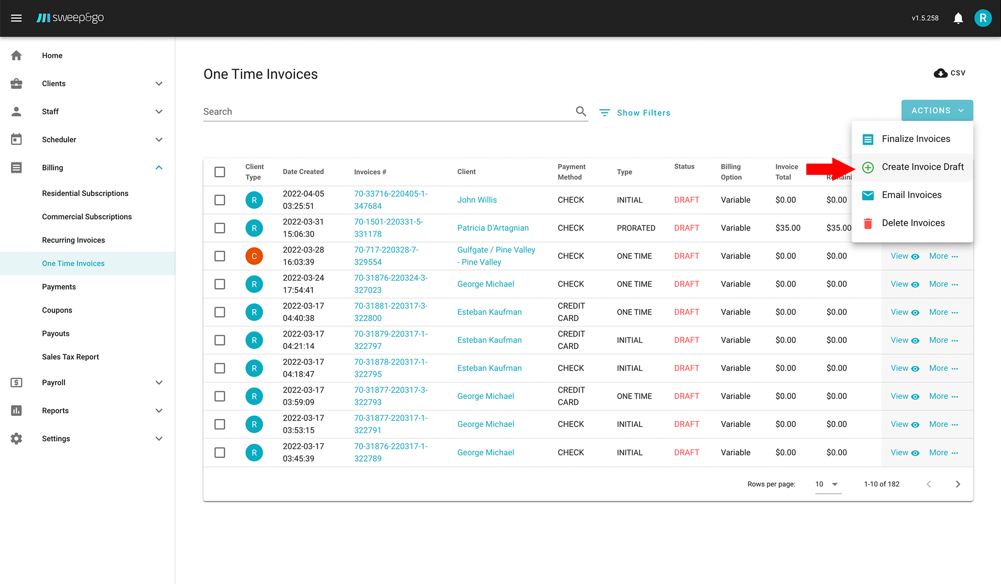 To create a custom invoice draft, go to One Time invoices > Actions > Create Invoice Draft. You may also create a custom invoice if you go to client details > Billing section > Invoices tab > Create invoice draft.