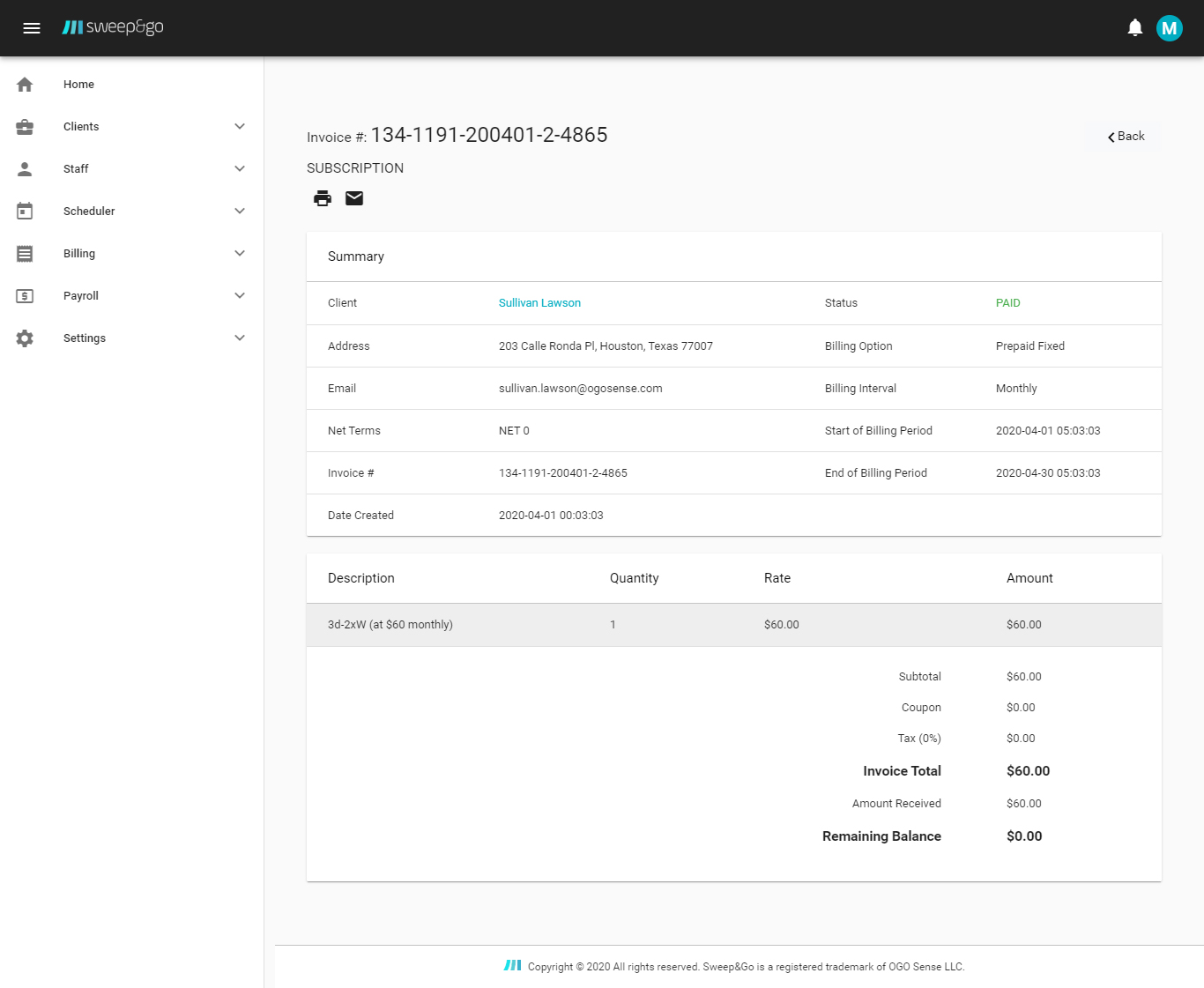 Sweep&Go makes invoicing your clients very easy and almost completely automated because the application creates all invoices for you in draft mode. Those of you who may be used to more manual invoicing will need to slightly adjust to Sweep&Go invoicing process.