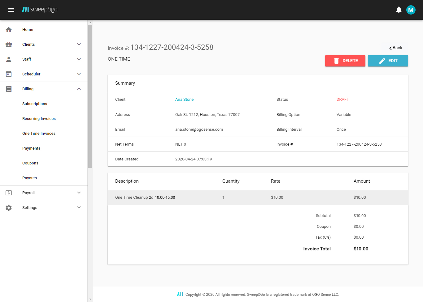 If a new client requests a one time cleanup or after you complete a custom job for past client without an active billing subscription, the app will automatically create you a one time invoice draft.
