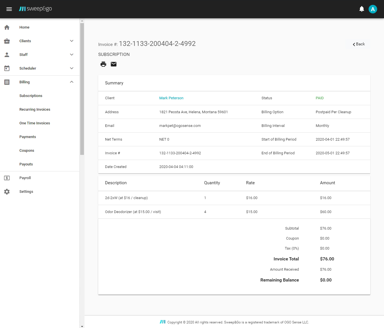 If a client uses a per cleanup postpaid subscription, then an invoice draft is created automatically at the end of the billing cycle. The invoice draft is only created if there were completed or skipped cleanups during the subscription period and invoice price is based on the number of cleanups, price per cleanup, any billable skipped cleanups and any applicable sales tax.