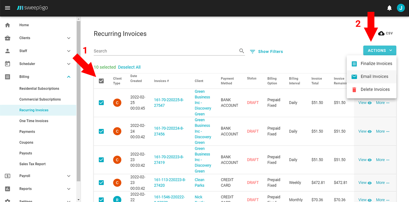 Recurring invoice drafts are created automatically and may be found within Billing > Recurring Invoices. You may finalize up to 50 invoice drafts at once. After you finalize the invoice an email with invoice pdf is automatically sent to the client. If needed, you may resend multiple invoices at once.