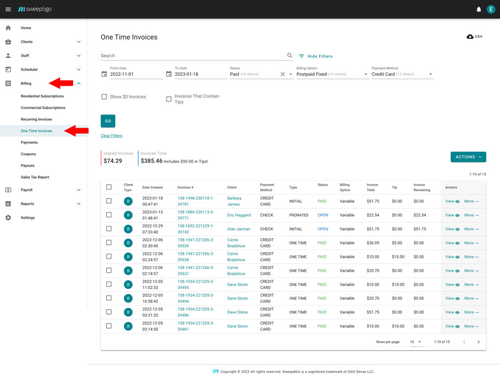 - Step 2: Go to Billing > One Time Invoices > Set filters correctly (Date range, Invoice Type, etc then Go)