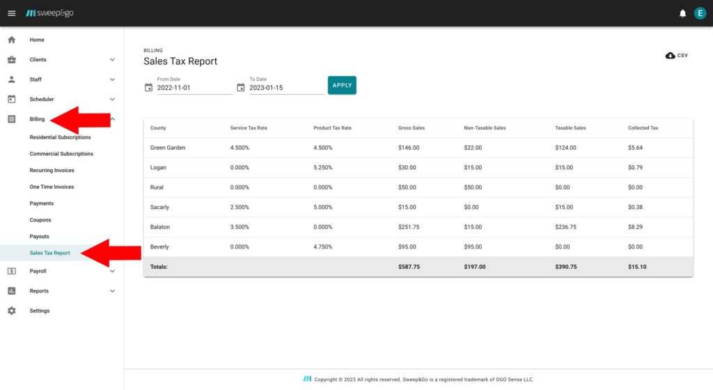 Here you may see your taxable and non-taxable sales, as well as export CSV file if needed.