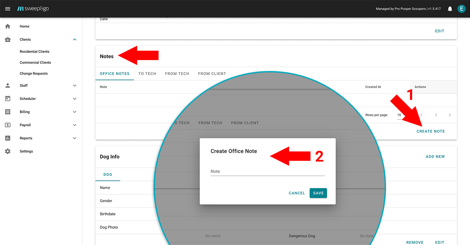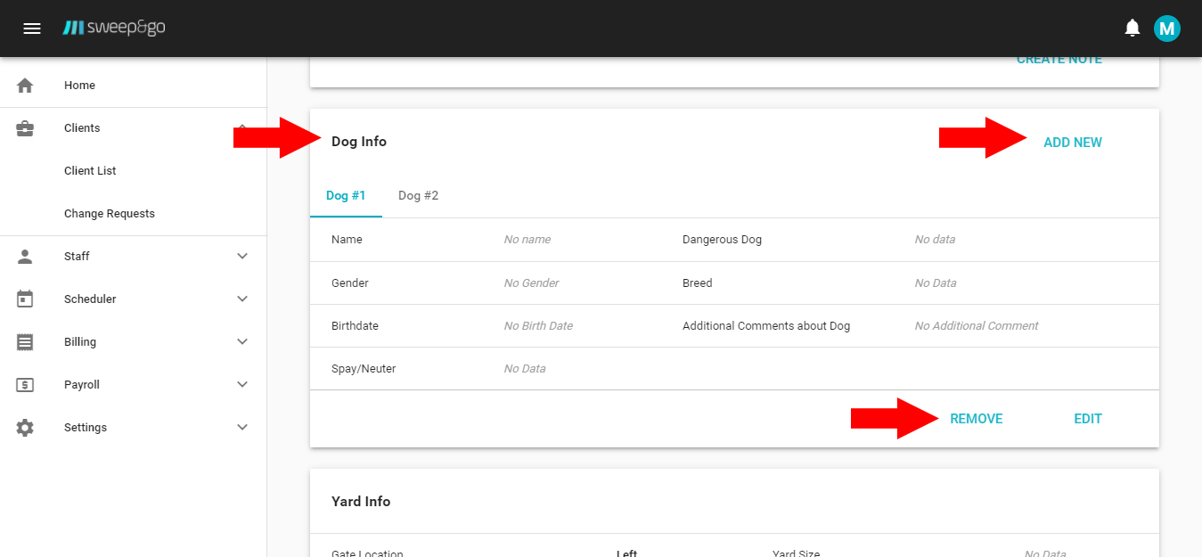 You may use client details views to manage info about the contact, location, billing, schedule, notes, dogs, yard, notification preferences and activity.