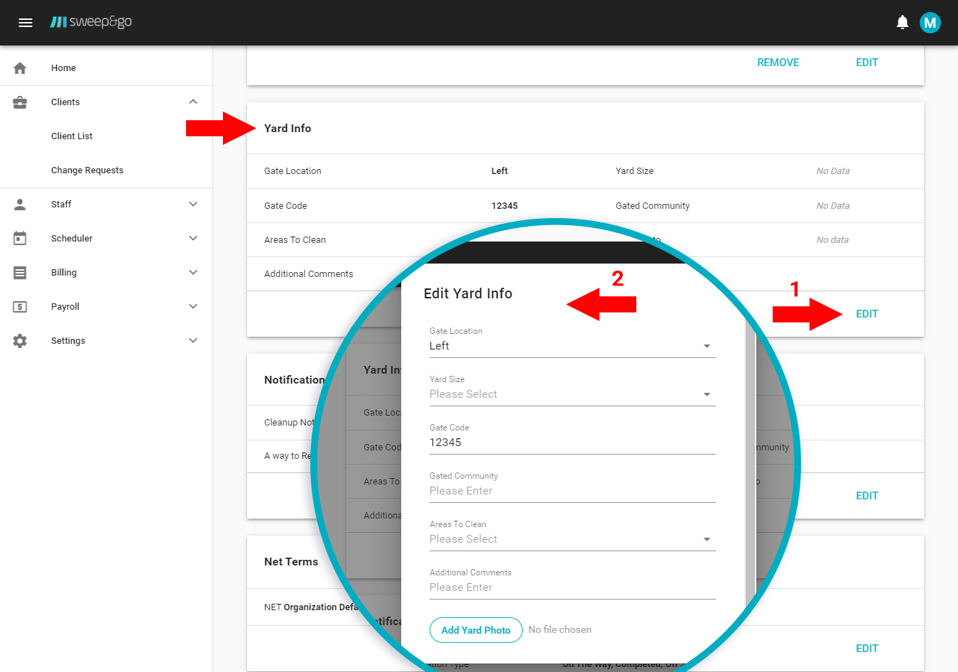 Under the Yard Info section you may manage yard size, gate location, access code or areas to clean.