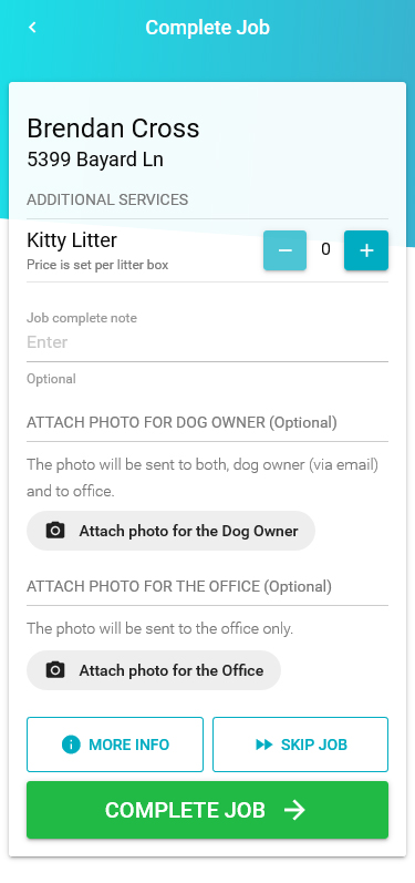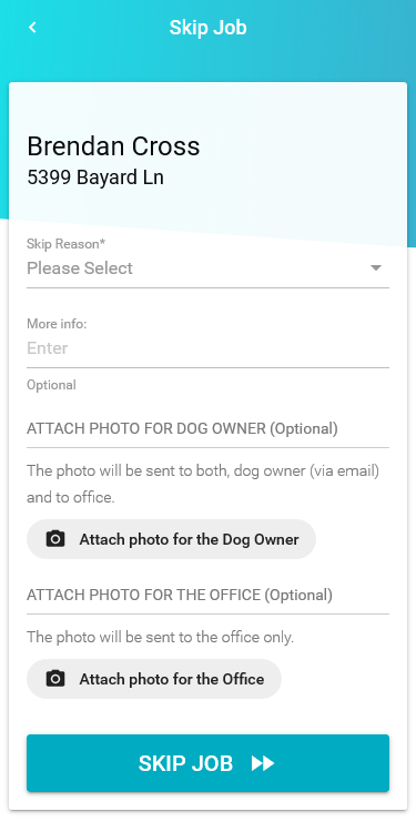 Before you complete a job you have an option to enter a job note, attach a photo for the dog owner (For example: yard photo or locked gate photo) or the office or skip the job for any reason.