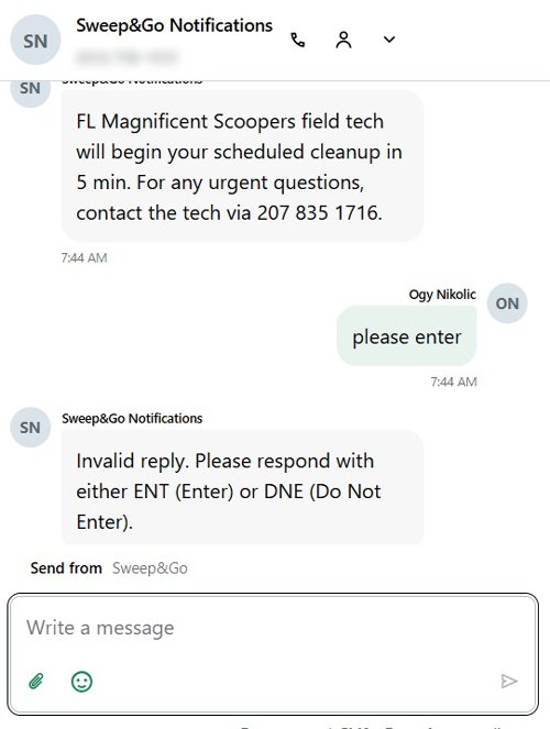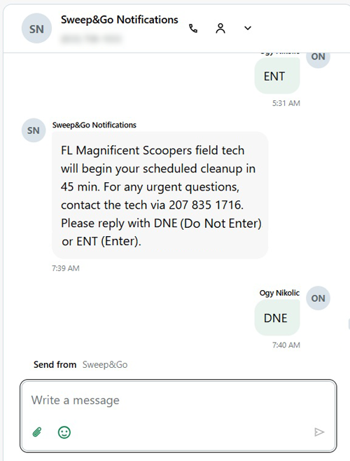 The client will be asked to reply with either “DNE” (Do Not Enter) or “ENT” (Dogs Are Secure, Please Enter) so the technician knows whether it is safe to enter the yard.