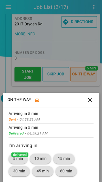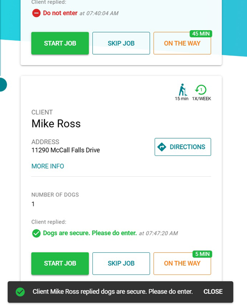 If a client’s dog is marked as dangerous, the “On the Way” notification will include an additional message.