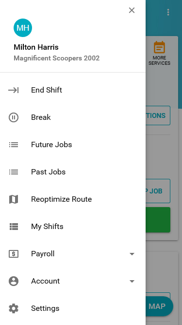 Under the menu on the left, field techs may start a break, see future and completed jobs for the current day, reoptimize their route, view shifts, check payroll (if additionally enabled), change their password or email and choose their default mapping service within the settings.